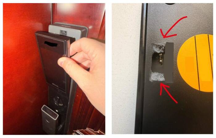 “花了1400块买的某知名品牌的智能锁,用了不到一年,塑料壳上的卡扣就断了,关门时候连着电池掉下来差点砸伤我的手。从断裂的横截面看,箭头灰白色的应该是加入过量的碳酸钙导致变脆。塑料制品加碳酸钙很常见,可以改变物理性能和降低成本,但是加过量就是偷工减料。这个上千块的东西,选这种质量的外壳,这就太过分了。那个塑料外壳厂家估计也是为了打价格战,这里可以省几毛钱下来,但是口碑砸了!”